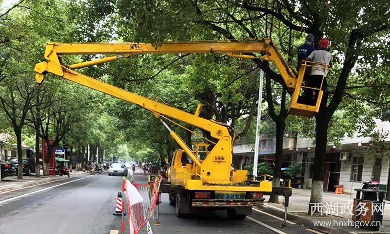 为确保此次任务圆满完成,西湖公司成立专门的工作小组,全过程组织开展此项工作,针对镇区行人、车辆较多的现场环境特点。一是做好做好交通指挥工作,确保现场车辆、行人的安全;二是对于与带电线路安全距离不够的树木,采用绝缘杆或停电的方式开展修剪,确保安全;三是加强修剪人员自身安全管理,做好高空作业的安全措施及高温天气的防暑降温工作。