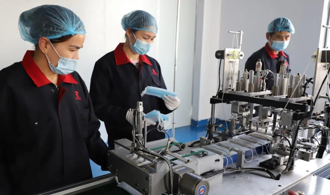 走进车间,记者看到,生产车间上线了一台全新的口罩机,在这个自动化车间里,口罩正以极快的速度从机器中“飞”出,自动压边缝合,自动上绳,很快装满一大筐。
